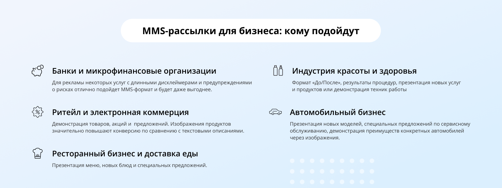 MMS подойдут для многих сфер бизнеса, но особенно эффективно для определенных категорий бизнеса: